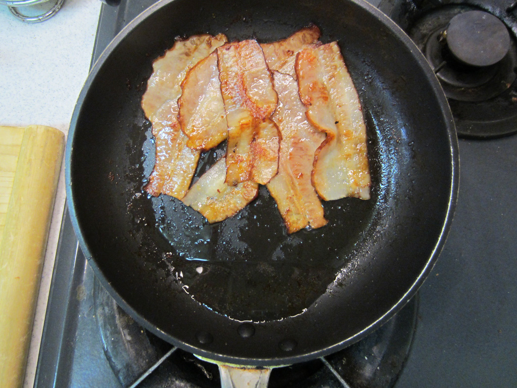 適宜、ベーコンの位置と裏表を返しながら、”ベーコン自身の脂”で、揚げる感じで焼いていきます。